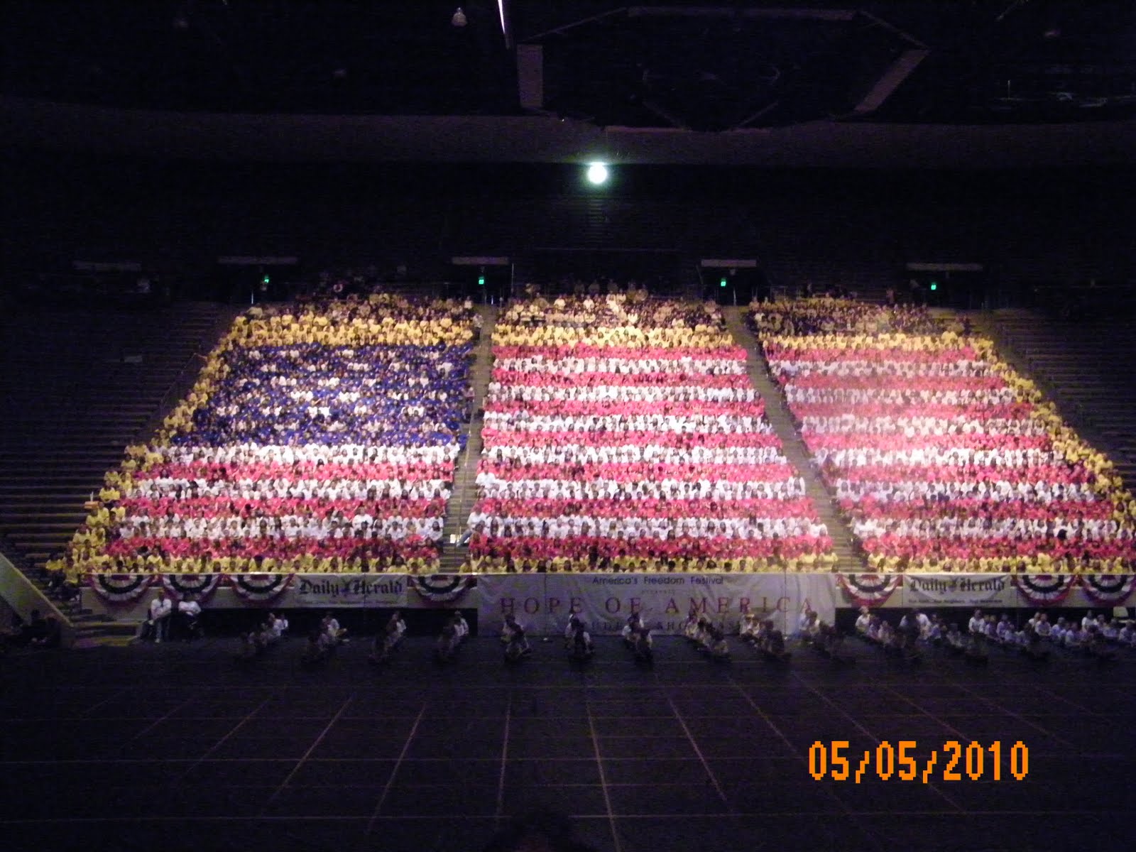 M'Tali is the on the top row of the white stripe, third person over!!!Students from about 32 school perform in this program, all the students wear shirts to make a flag, this was M'Tali's 2nd time performing in it but it was our first time being able to watch it. The first time her and Dallin were in it we were in New York, it was such a fun night and they did such a good job, we are so proud of you M'Tali!!!!
